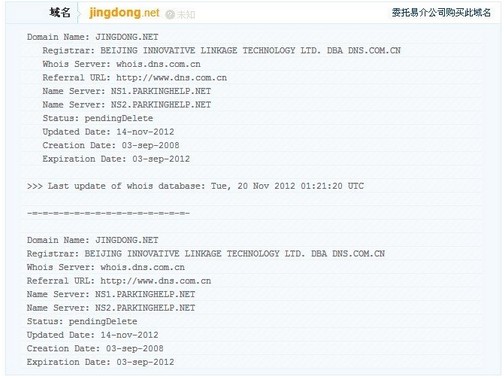 whois信息显示,jingdong.net注册于2008年9月,该域名的到期时间为2012年9月,此次域名所有者也是非常大意,毕竟有着“京东”坐镇,jingdong.net的关注度肯定不会少。