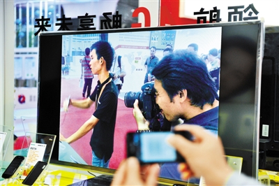 昨天下午,在深圳会展中心第十四届高交会的4号展馆海信公司的展台前,一位正在拍照的记者被工作人员用手机拍照后马上上传到电视屏幕上。记者 李博 摄