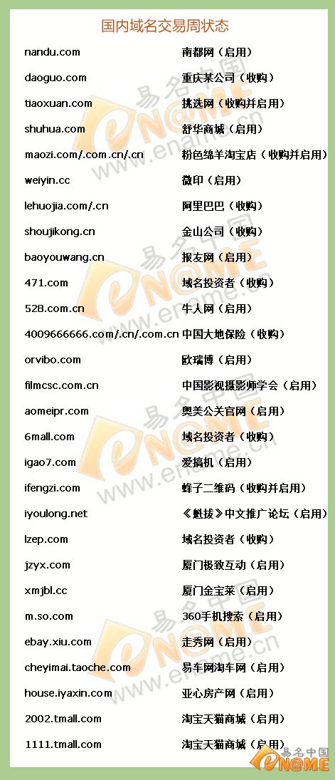 双拼域名以它简单易记的优势,在国内一直非常吃香,本周也有多个双拼域名被启用和收购,南都网上新logo,百万级身价域名nandu.com助阵,传闻重庆公司五位数收购岛国双拼域名daoguo.com,“挑选”双拼域名tiaoxuan.com以近30万元的价格易主搭建海外代购折扣网站,淘宝天猫店粉色绵羊在易名中国交易收购了全套“帽子”域名maozi.com/.com.cn/.cn,等等。