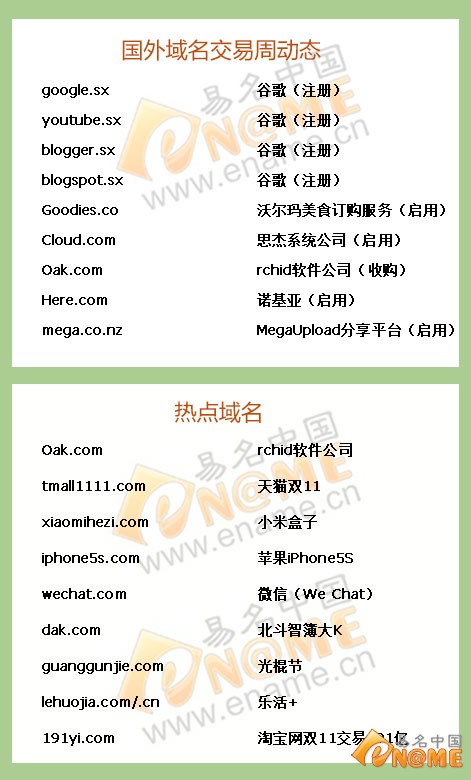 淘宝上演了一场双11的神话剧使之无疑成为了本周的热点,淘宝双十一大促,仅一天时间,其支付宝交易总额就已达191亿,而191亿域名191yi.com立马被电商人士龚文祥抢注。小米也在本周发布了自己的机顶盒小米盒子,四拼域名xiaomihezi.com/cn都被抢注。