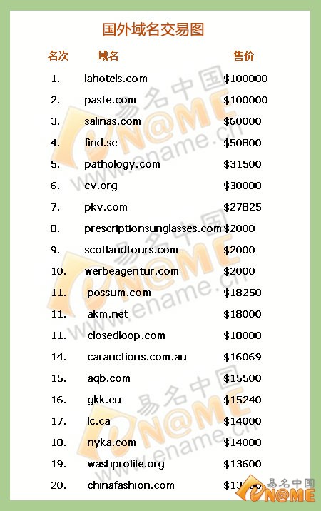 放眼海外交易市场,最抢手的域名是通过Sedo平台出售的域名LAHotels.com和Paste.com均以100,000美元的价格成功交易,位列榜单第一位和第二位,Salinas.com域名以60,000美金价格紧跟其后,排行老三。Salinas可用作人名萨利纳斯,在巴西、波多黎各(美)、美国等地也用作地名萨利纳斯。值得一提的是瑞典国别域名Find.se以50,800美元杀进前四。