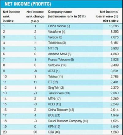 事实上,全球运营商整体的利润情况并不是太好,远远不如中国三大运营商的情况。数据显示,100强的净利润为1011亿欧元,比去年减少了270亿。而且,目前还有13家处于亏损状态,另有8家公司未显示赢利情况。